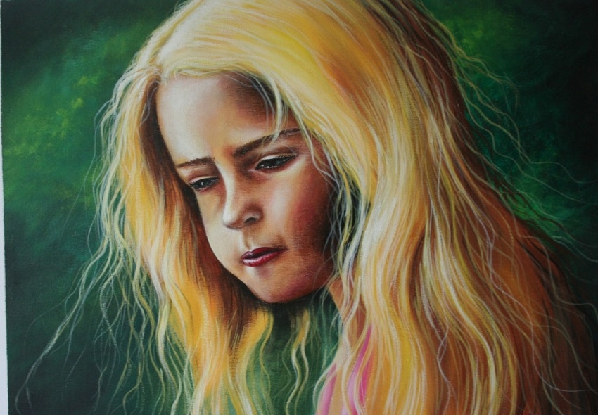 Praca wykonana pod wpływem uroku zdjęcia dziewczynki na jednym z portali artystycznych (obraz na płótnie z białym obrysem dookoła).